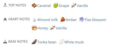 Heart notes: Almond Milk, Amber, Flax Blossom, Honey, Vanilla