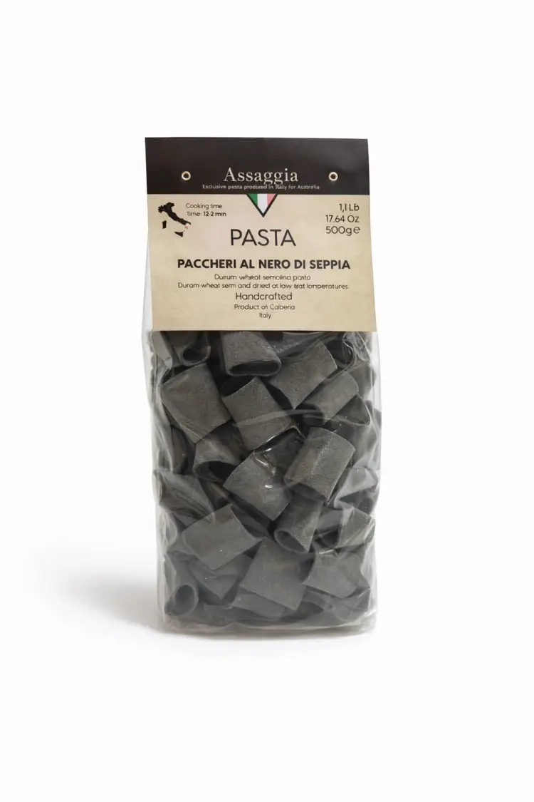 Statement paccheri tubes in deep black—made in Italy to hold rich seafood ragù and creamy shellfish sauces.