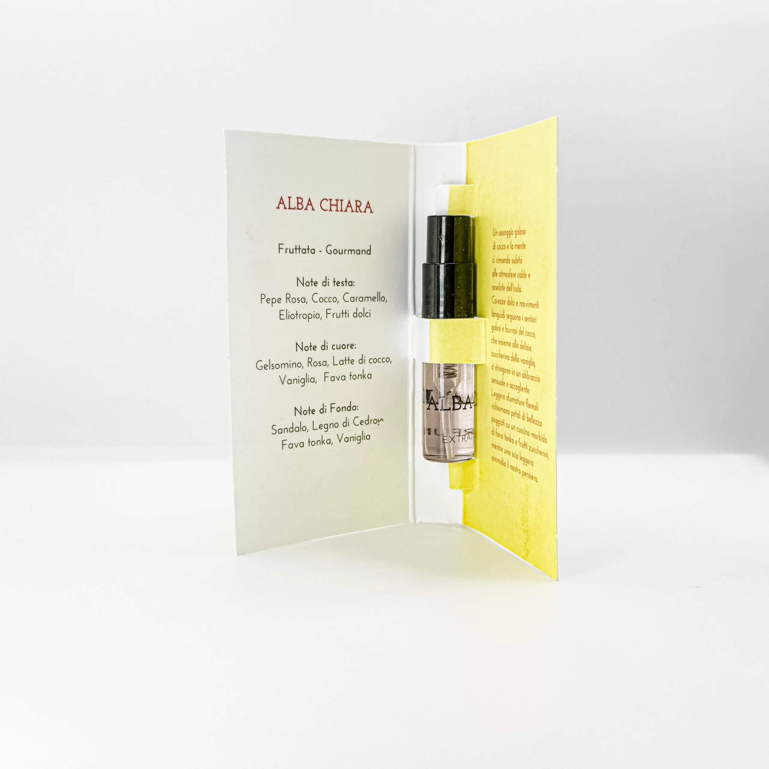 Alba Chiara: A luminous floral-gourmand blending pink pepper, jasmine, coconut, and vanilla, capturing the warmth and sweetness of a Mediterranean sunrise.