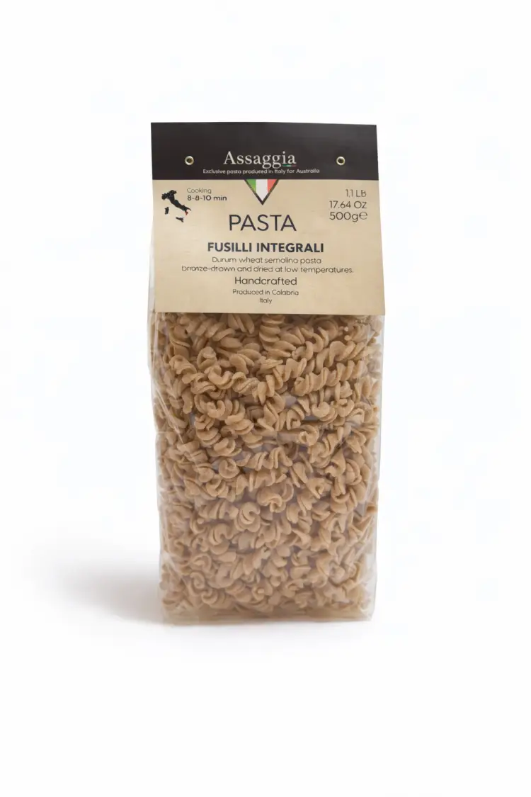 Nutty wholewheat fusilli spirals—made in Italy to grip sauce and deliver premium texture.