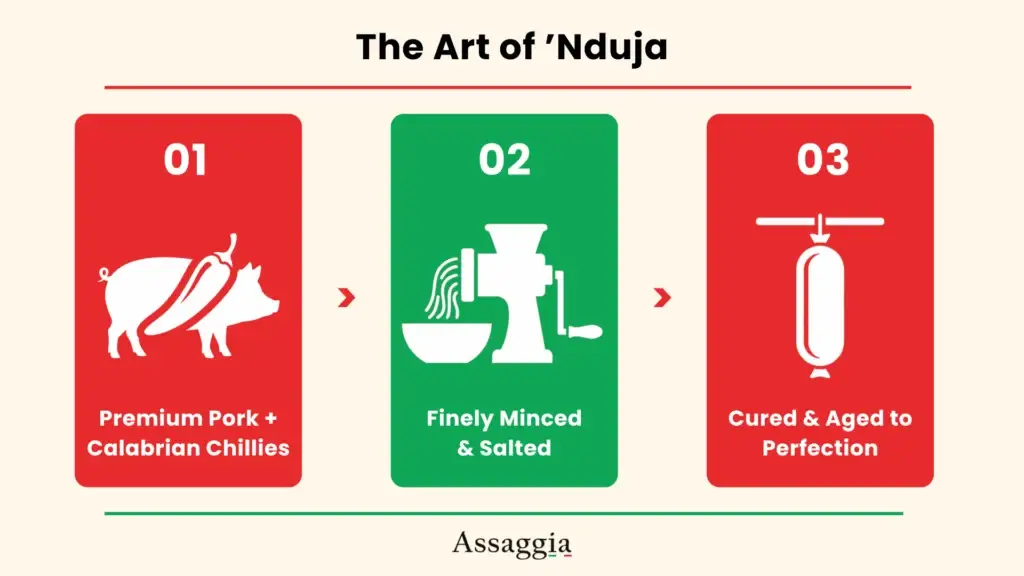 The production of ’nduja is a masterclass in simplicity and quality. There are only three core ingredients: pork, salt, and a significant amount of Calabrian chilli peppers.